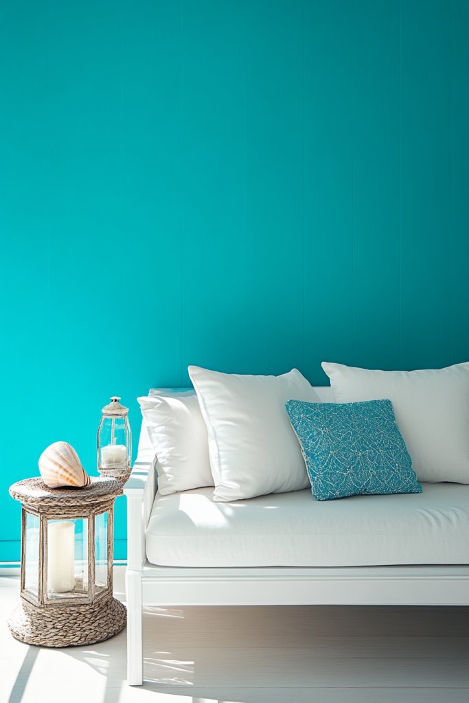 Picture a living room with turquoise walls or accents paired with white and sandy neutrals. Wicker or rattan furniture, light linen textiles, and coastal-inspired decor complete the scene. Sunlight plays off the vibrant color, making the space feel lively and open. Small accessories like seashells or coral add extra charm without cluttering.