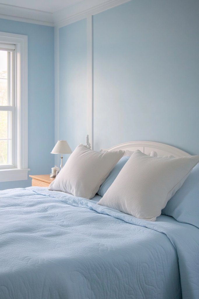 Picture a bedroom with pale blue walls paired with crisp white bedding and textured linens. Gentle lighting enhances the soothing atmosphere, while subtle decorative details add interest without clutter. Soft curtains and plush rugs complete the serene scene. The space feels peaceful, airy, and refined.