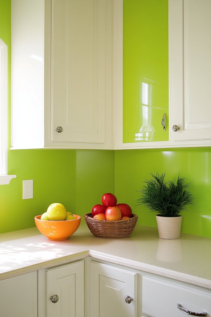 Imagine cabinets or walls in a crisp apple green, paired with white or neutral countertops. Bright, colorful accessories, such as utensils or dishware, pop against the lively background. Natural light enhances the freshness, making the space feel open and inviting. Add textured textiles or patterned rugs for extra visual interest.