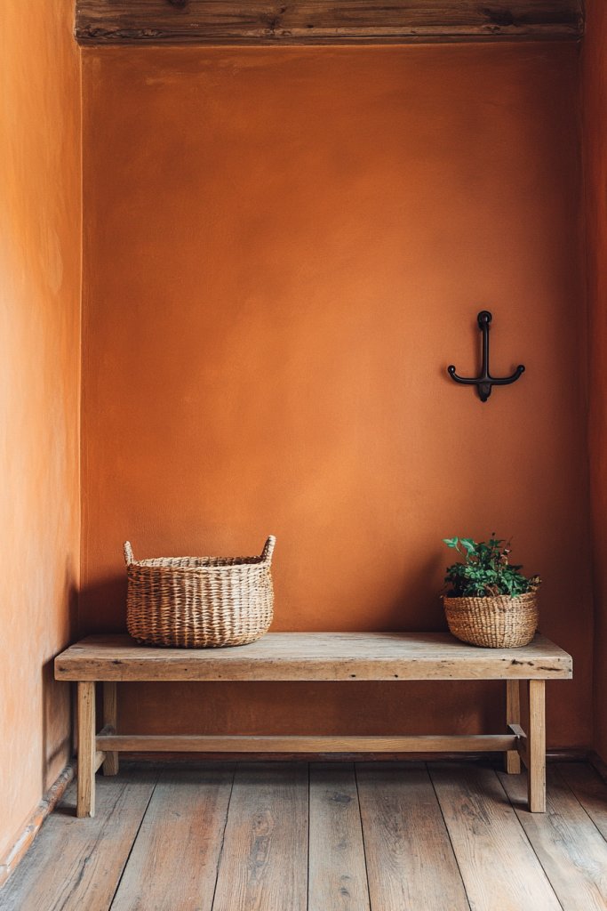 Imagine a rustic entry with terracotta-colored walls paired with reclaimed wood accents and vintage-inspired hardware. Natural fiber rugs and woven baskets add texture, creating a cozy, farmhouse feel. Soft lighting in warm tones highlights the earthy palette, while a sturdy wooden bench invites guests to sit and remove shoes comfortably. The overall look feels grounded and welcoming.