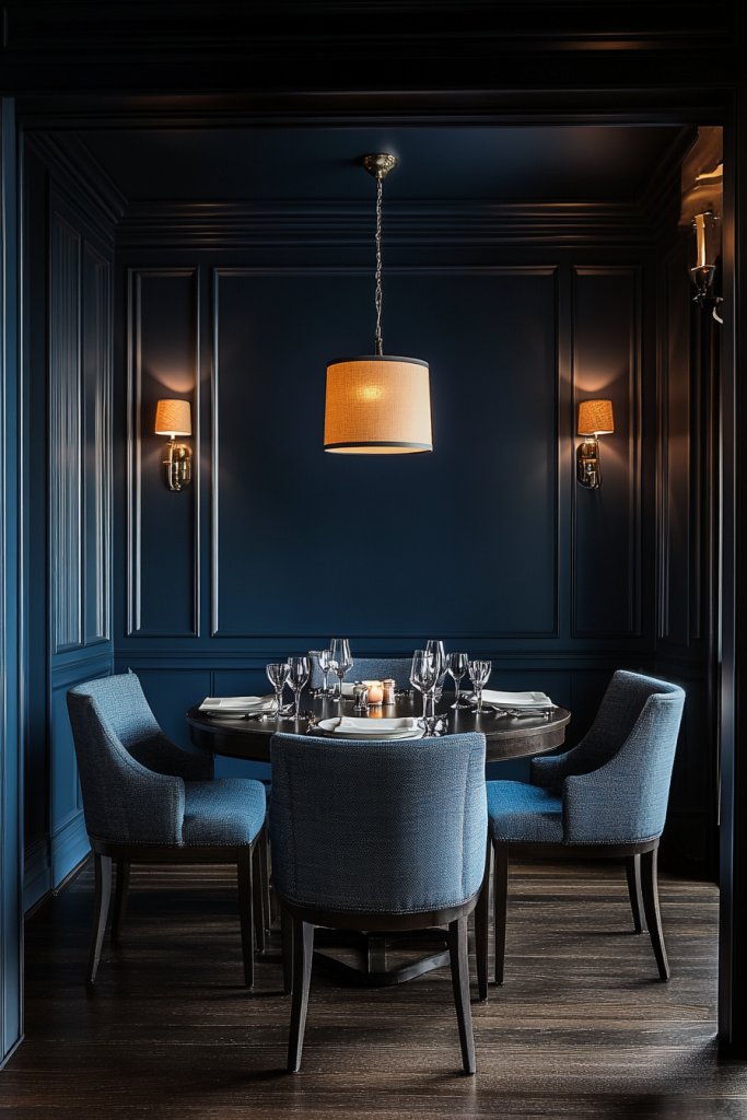 Picture a dining room with navy walls that create an intimate, moody atmosphere. Complement the walls with gold or brass light fixtures and elegant glassware. Place a sleek, dark wood table adorned with plush cushions or textured table runners. The overall feel is upscale, warm, and inviting, perfect for making a statement.