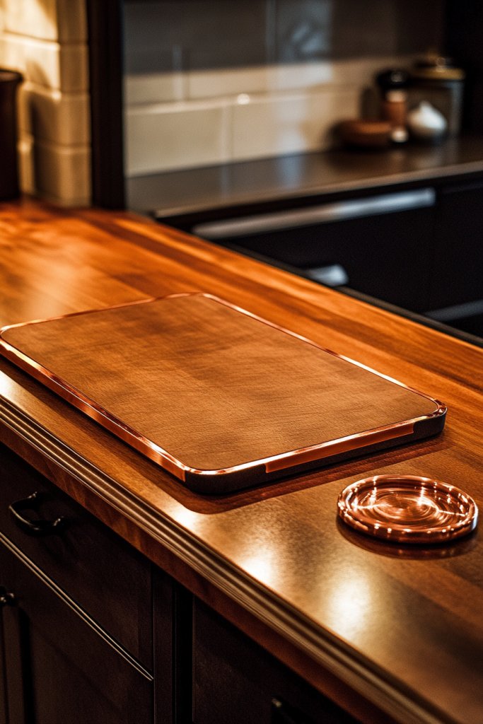 Looking for functional kitchen decor that also adds a touch of elegance? Copper-edged cutting boards or trivets can do just that. They elevate your prep areas and serve as stylish accents when not in use. It’s a subtle way to bring warmth and sophistication to everyday essentials.