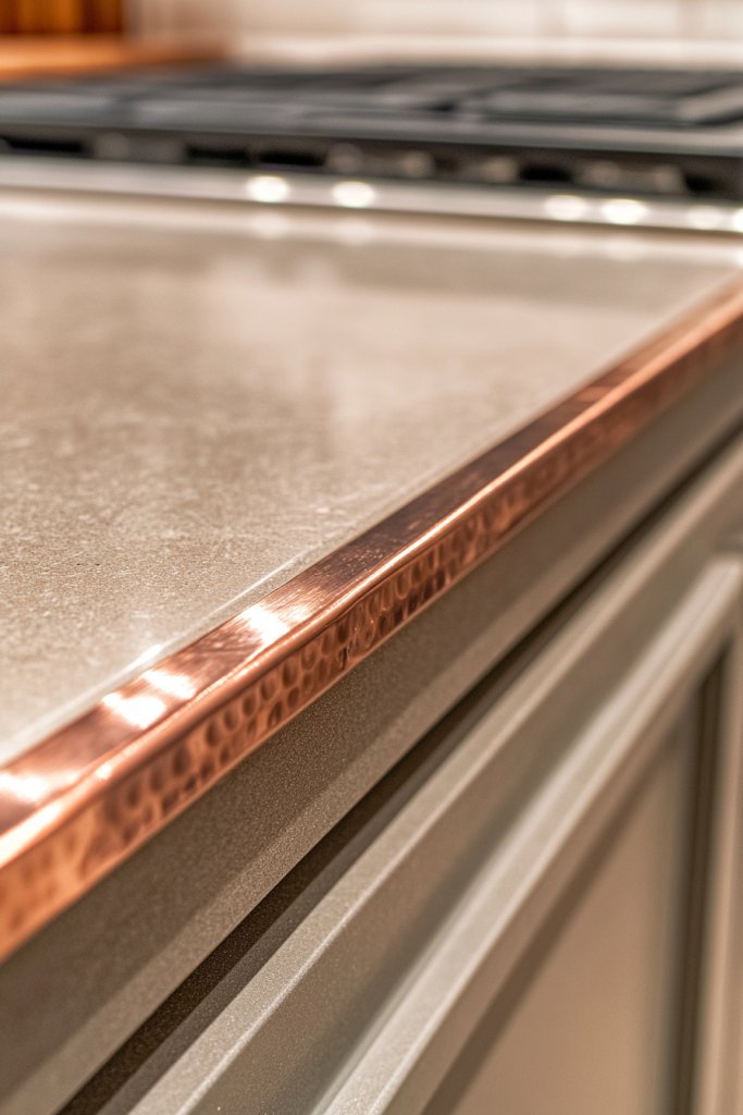 Choose from brushed, hammered, or polished copper finishes based on your style preference. Incorporate inlays into islands, breakfast bars, or edges of countertops for subtle accents. Seasonal variations could involve mixing copper with other metallic tones like brass or bronze. For more rustic kitchens, opt for textured, hammered copper inlays.