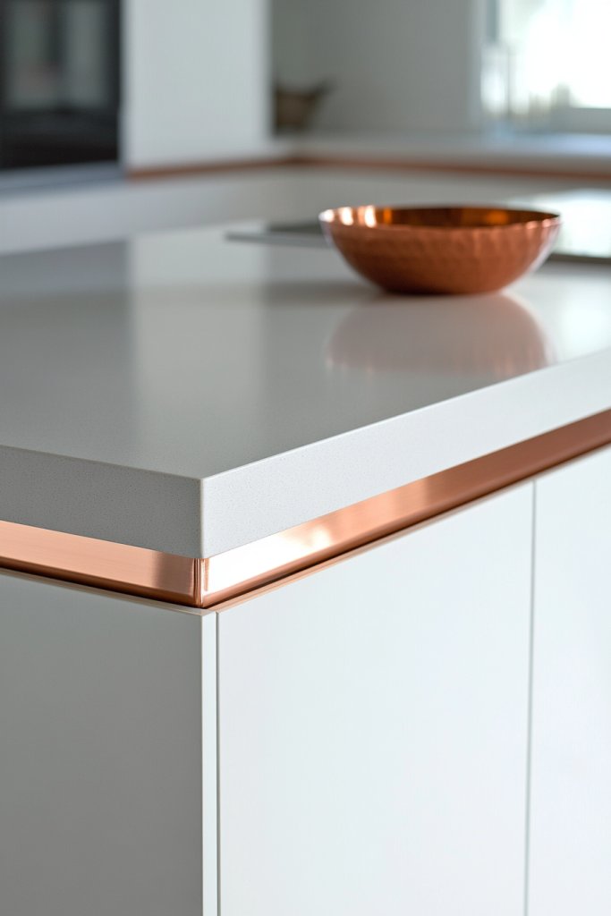 Imagine a sleek quartz or granite countertop with a narrow copper strip running along the edge. The metallic sheen adds depth, catching the light as you move around. Or visualize a small copper inlay embedded into your workspace, creating a beautiful contrast with natural stone. These details add elegance and sophistication.