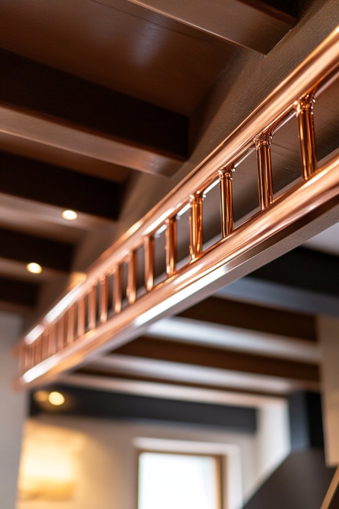Imagine copper railings running along exposed ceiling beams, their warm finish catching the light. Or picture copper accents embedded into ceiling panels or coves, adding texture and depth. The metallic glow draws the eye upward, giving your kitchen a polished, luxurious feel. It’s an unexpected detail that elevates the overall design.