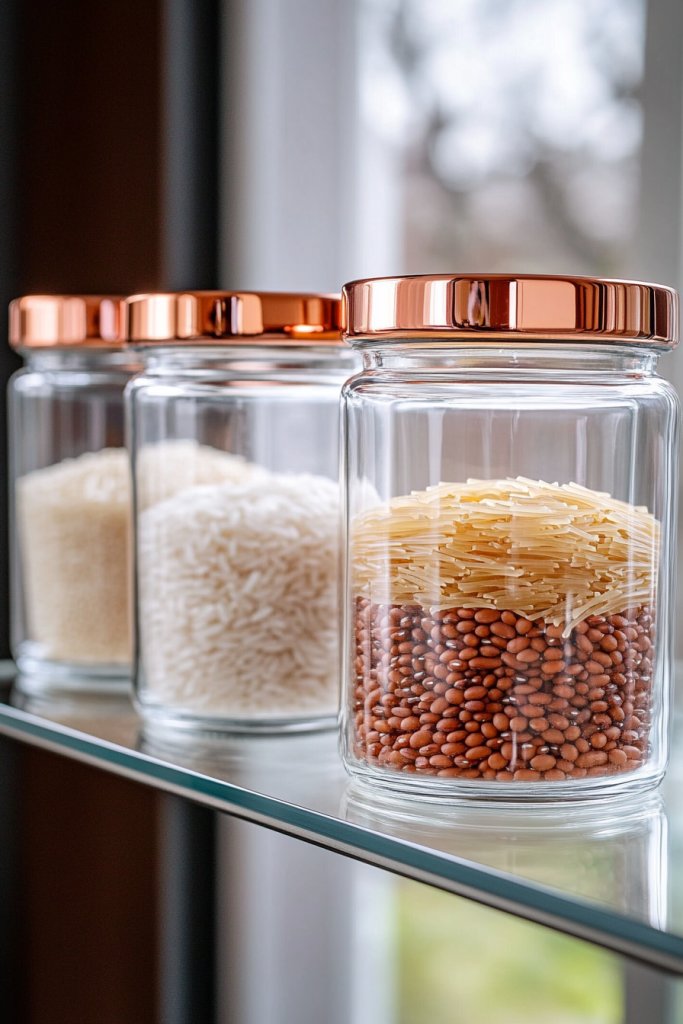 Imagine clear glass jars with copper lids or rims lined up on open shelves or countertops. The transparency lets you see contents easily, while the copper details add a touch of elegance. The shiny metallic accents contrast beautifully with colorful spices, grains, or pasta, creating a vibrant, organized look. This mix of function and beauty makes everyday storage special.