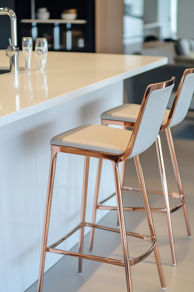 Picture sleek bar stools with copper accents on the legs or footrests, their warm finish catching the light. The combination of wood, fabric, or leather with copper details creates a luxurious vibe. When arranged around your island or breakfast bar, they form a stylish gathering spot that feels both modern and inviting. The metallic touches add a layer of depth and richness.