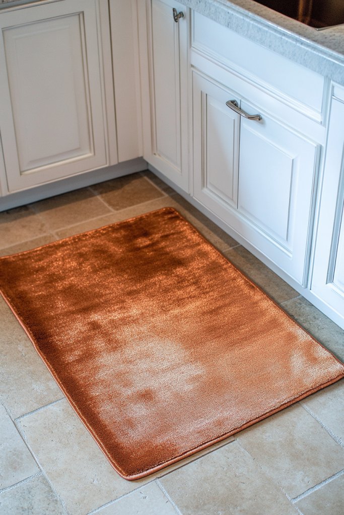 Picture a soft, plush rug in a warm copper hue placed near the sink or cooking area. The textured surface feels inviting underfoot, while the metallic accents catch the light subtly. These rugs add a layer of luxury and warmth, turning a utilitarian space into a cozy retreat. The rich color complements other copper accents, tying the decor together.