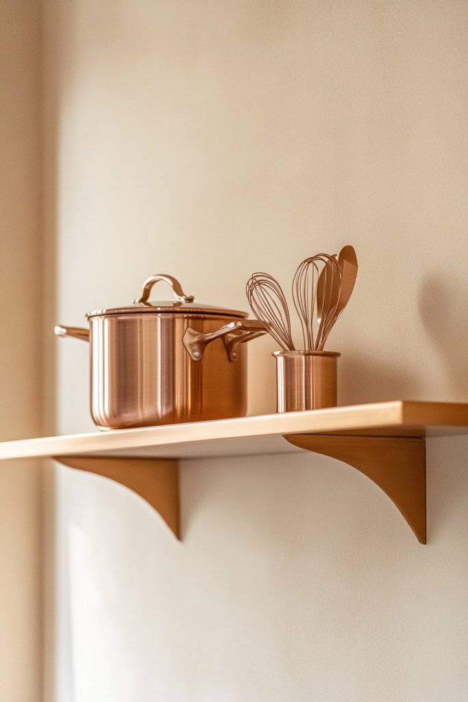 Envision floating copper shelves mounted on a neutral wall, their warm hue contrasting beautifully with light-colored cabinets. They hold a curated collection of colorful dishes, glassware, and everyday essentials. The textured copper surface catches ambient light, creating a subtle shimmer. The open design invites you to display your personality while keeping things accessible.
