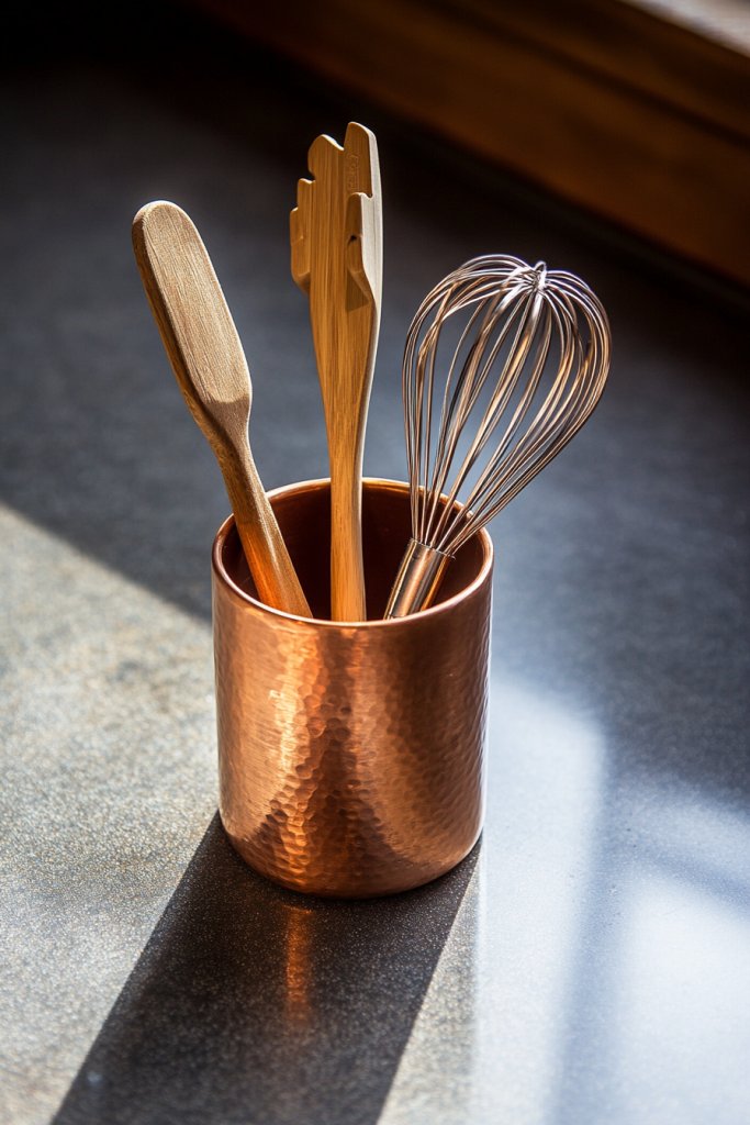 Copper utensil holders blend practicality with elegant design, making your cooking space more efficient and inviting. They also serve as a quick style upgrade that doesn’t require a total overhaul. With a few simple choices, you can elevate your kitchen’s look and feel—your new favorite accessory is just a countertop away!