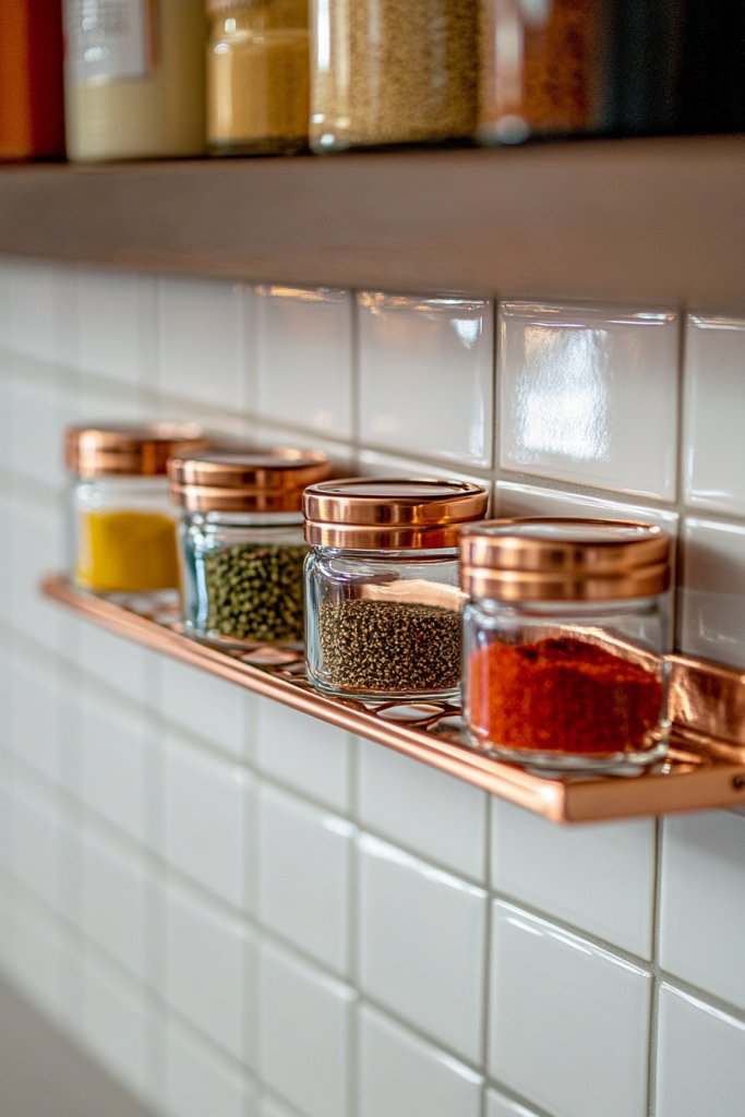 Use uniform copper jars with matching lids for a clean look or mix different shapes and finishes for an eclectic vibe. Mount racks on a backsplash or inside a cabinet door for space-saving storage. Seasonal adjustments might involve swapping out labels or adding decorative touches like engraved patterns. Incorporate complementary colors like deep reds or earthy browns for a warm, inviting feel.