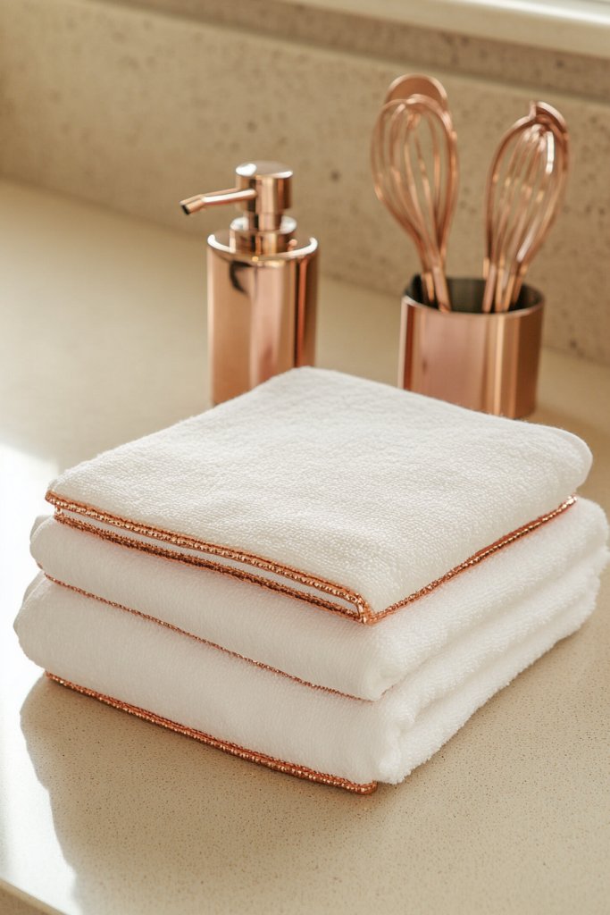 Copper-trimmed towels and accessories are an easy, affordable way to add warmth and sophistication. They subtly tie together your decor, making your kitchen feel more polished. With just a few carefully chosen pieces, you can elevate your everyday routines into moments of style. Ready to refresh those towels? Style and function go hand in hand!