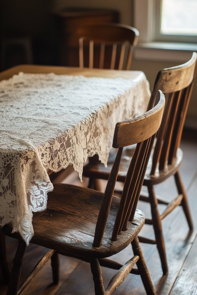 1. Vintage Lace Tablecloths Paired with Rustic Wooden Chairs