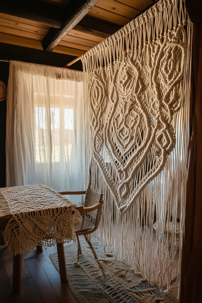 Visualize intricate knotted patterns cascading from a wooden dowel or ring, framing your walls with organic shapes and fringe. On the table, smaller macramé runners or coasters introduce tactile detail. Natural fibers in neutral or earthy tones blend seamlessly with wood and linen, creating a layered, cozy aesthetic. It’s like having a piece of nature’s artistry hanging or sitting in your home.