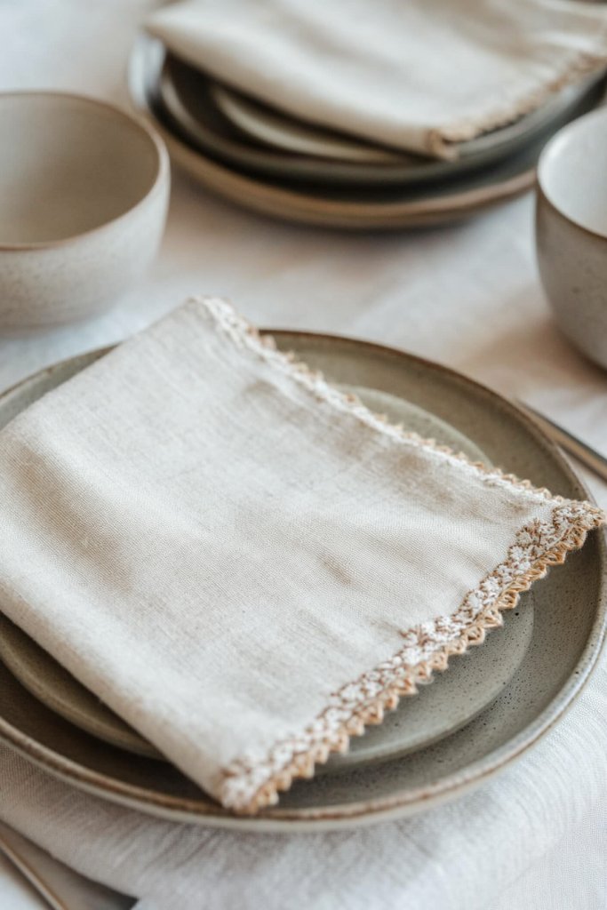 Imagine soft, textured napkins in natural fibers, edged with delicate embroidery—floral patterns, scalloped borders, or tiny stitches. The craftsmanship adds a personal, artisanal feel that makes your table feel warm and inviting. Folded neatly beside vintage plates or stacked in a ceramic holder, they invite guests to indulge in a slower, more beautiful dining experience.