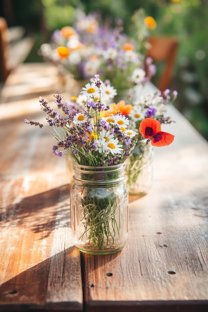 Use different sizes and shapes of jars for a layered, eclectic look. For a seasonal twist, swap wildflowers for berries or herbs like rosemary or thyme. You can also add ribbon or twine around the jars’ necks or paint them in pastel shades for a more polished aesthetic. For outdoor or rustic settings, leave the jars plain for a more authentic feel.