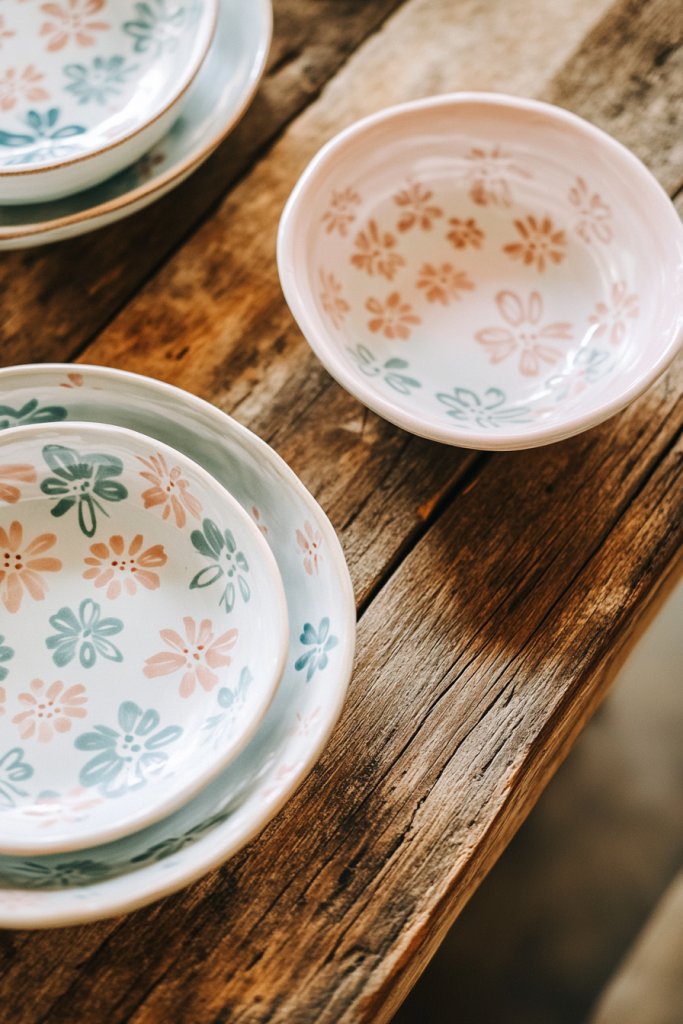 Picture each dish with hand-painted flowers—roses, daisies, or peonies—delicately swirling across the surface. The imperfect brushstrokes and textured glazes give each piece character and warmth. The soft, matte finishes contrast beautifully with glossy accents, creating visual interest. When arranged on a rustic wooden or linen-lined table, they evoke a vintage, cottagecore charm.