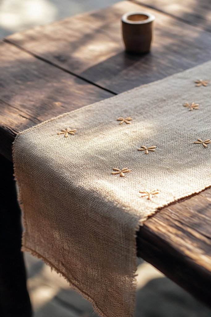 Picture a natural burlap runner laid across a wooden table, accented with delicate embroidery—floral patterns, scalloped edges, or tiny stitches. The rough texture contrasts beautifully with smooth ceramic dishes and soft linen napkins. Embroidered details catch the eye, adding charm and a personal touch. The overall effect is cozy, inviting, and effortlessly chic.