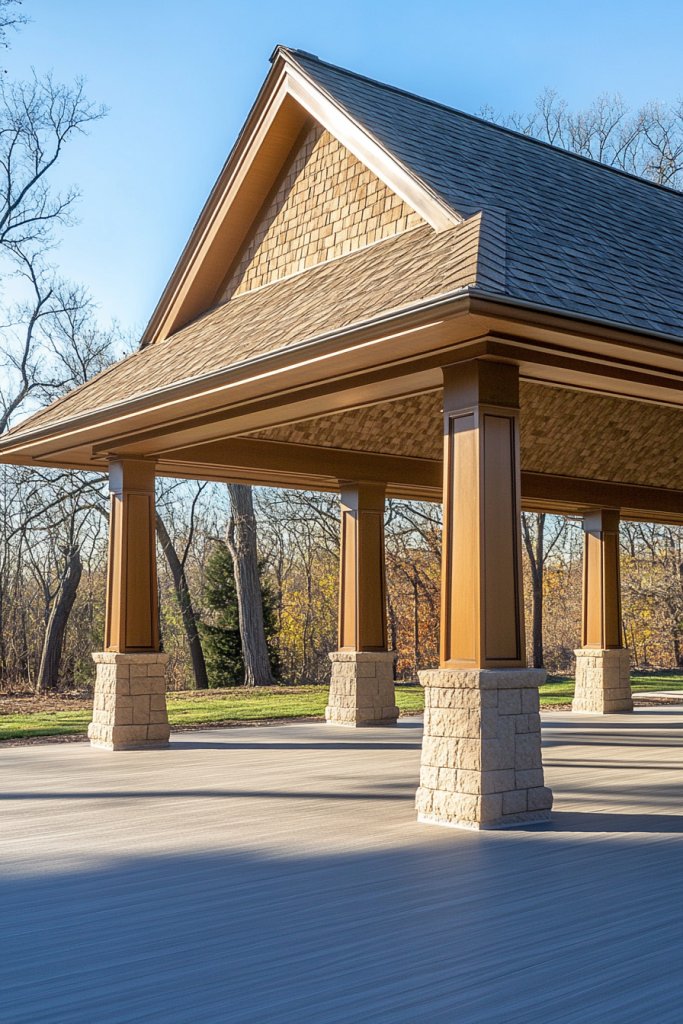 Want a stylish outdoor cover that also keeps the weather at bay? A hip roof with an overhang combines classic design with practical protection. It shields against sun, rain, and wind while adding architectural interest. Who wouldn’t love a timeless look that’s both functional and elegant?