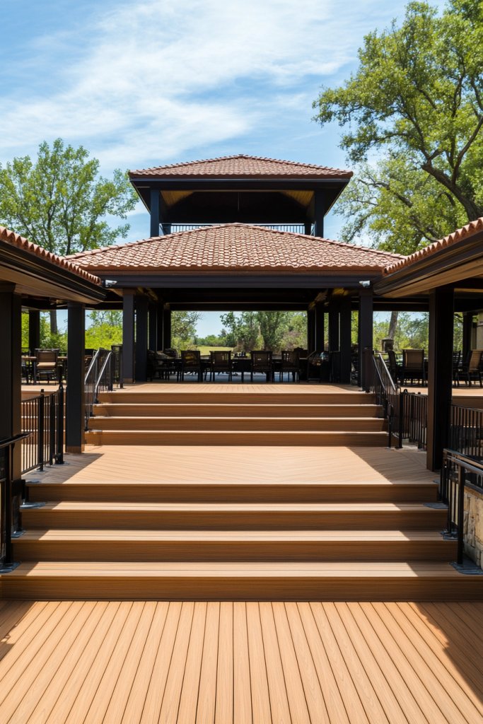 Want to create a multi-purpose outdoor space that feels organized and inviting? A stepped deck with different covered levels helps define zones for dining, lounging, and cooking. It’s perfect for large yards or patios where you want visual separation without walls. Who says outdoor spaces can’t be multi-dimensional?