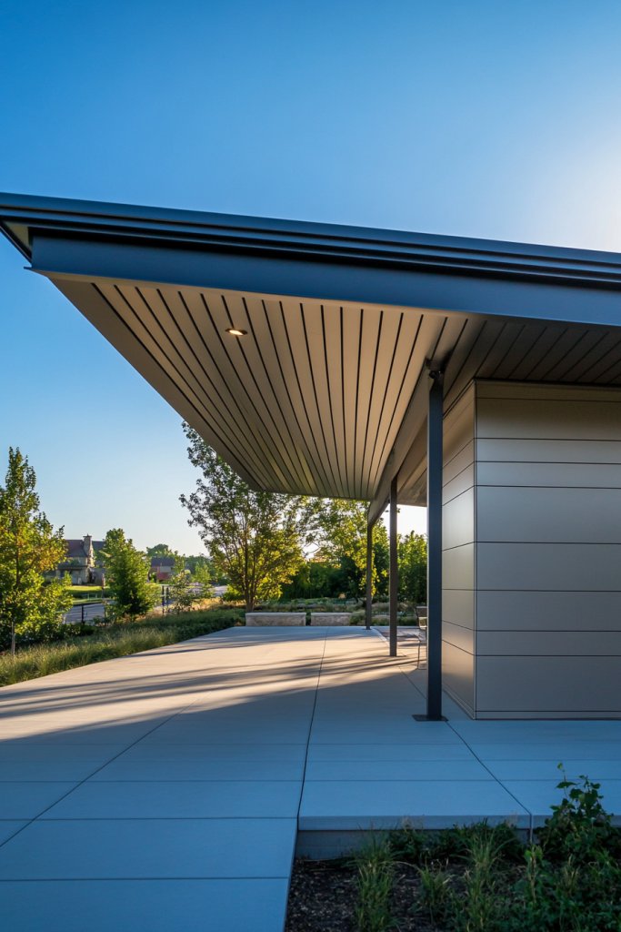 Picture a sturdy concrete or wood deck jutting out from your house, with a sleek, overhanging roof supported by hidden or angled beams. The cover can be flat or slightly sloped, finished with weather-resistant panels or metal sheets. Underneath, outdoor furniture and a textured rug create a relaxed, inviting zone. The overhang shades the space effectively, even during the hottest part of the day.