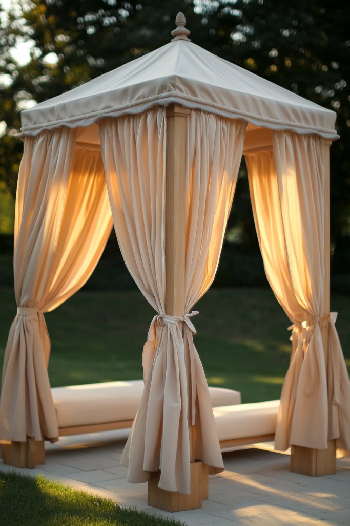Imagine a sturdy frame with a peaked roof, draped with flowing fabric that can be drawn closed or tied back. The curtains are made from weather-resistant textiles, swaying gently in the breeze. When drawn, they block out neighboring views and create a cocoon of comfort. The space feels enchanted, like a secret garden or outdoor ballroom.