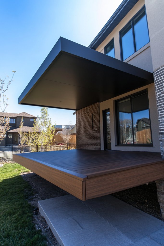 Choose materials like composite decking and sleek metal or wood for the support structure. You can customize the overhang length based on your shade needs and aesthetic preference. Add integrated lighting or fans underneath for comfort. The design can suit a variety of architectural styles, from ultra-modern to transitional.