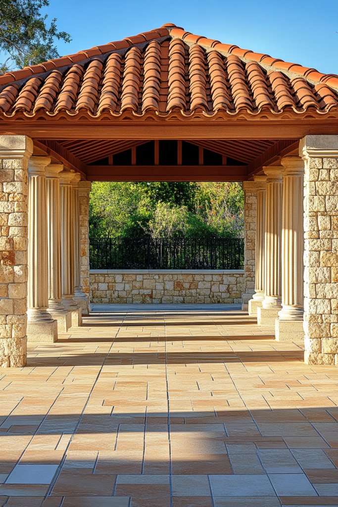 Dreaming of a Mediterranean-inspired outdoor retreat? A pavilion-style cover with open sides and a tiled roof captures that timeless charm. It provides shade and protection while remaining airy and inviting. It’s ideal for those who want a stylish, resort-like vibe right in their backyard.