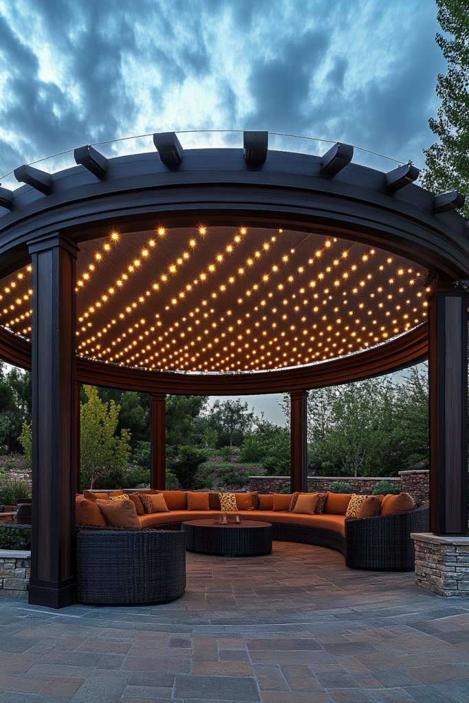 Opt for classic wood with a stained finish for a rustic look or sleek aluminum with minimalistic panels for a contemporary vibe. The LED string lights can come in warm white or color-changing options, depending on your mood. For seasonal changes, add fabric drapes or outdoor curtains to block wind and add privacy. You can also incorporate a built-in fire pit or outdoor heater nearby for extra warmth.