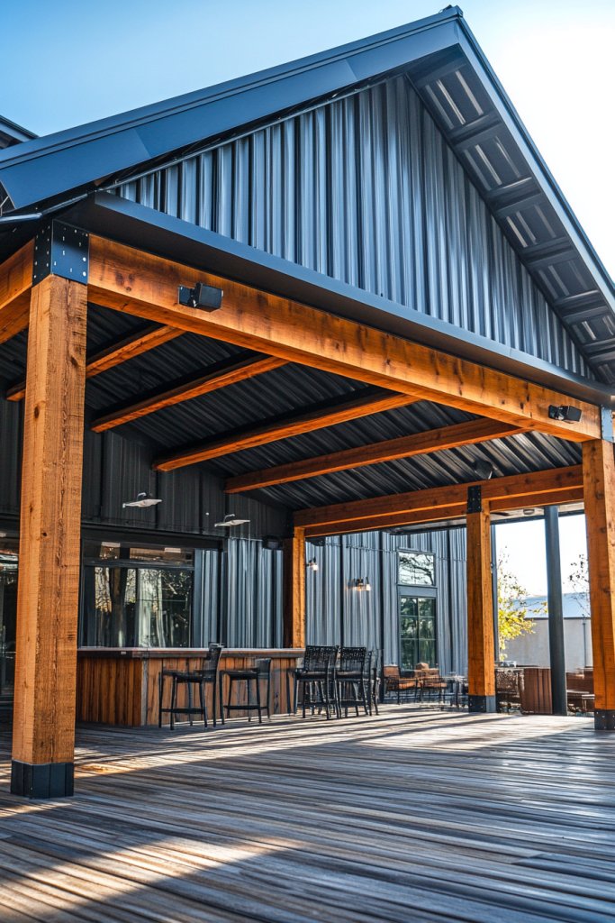 Craving an outdoor space that screams modern industrial chic? An industrial metal roof paired with sturdy wooden support beams hits that mark perfectly. It combines raw materials with warm accents, creating a space that feels both edgy and inviting. Ideal for urban dwellers or anyone who loves a contemporary vibe.