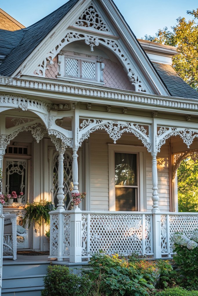 Opt for painted wood in classic white or pastel shades, or go darker for a more dramatic look. The trim can feature scrollwork, floral motifs, or geometric patterns for added detail. Seasonal touches include hanging baskets with flowers or decorative banners. The style adapts well to both small porches and large, wraparound verandas.