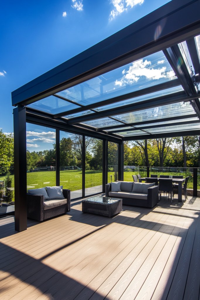Choose frameless glass panels for a seamless look or framed options for a more structured feel. The flat roof can be finished with a waterproof membrane or a sleek metal canopy. Seasonal adaptations include adding retractable awnings or outdoor blinds for sun control. Decor can be minimal—think neutral textiles, modern sculptures, or sculptural planters that complement the sleek aesthetic.