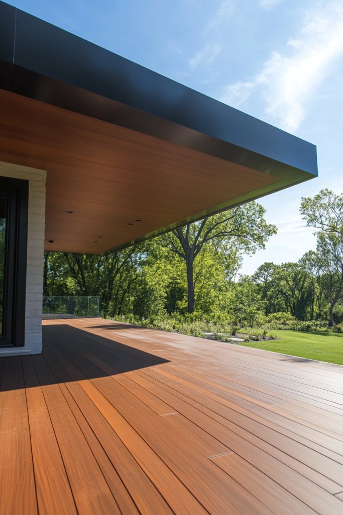 Imagine a streamlined roof with a gentle slope, crafted from metal or composite panels, extending slightly beyond the deck edge. The overhang creates a shadow line that plays beautifully across the space, especially during sunset. The smooth, uninterrupted surface feels both contemporary and calming. You see a seamless blend of architecture and outdoor living, with sleek lines emphasizing simplicity.