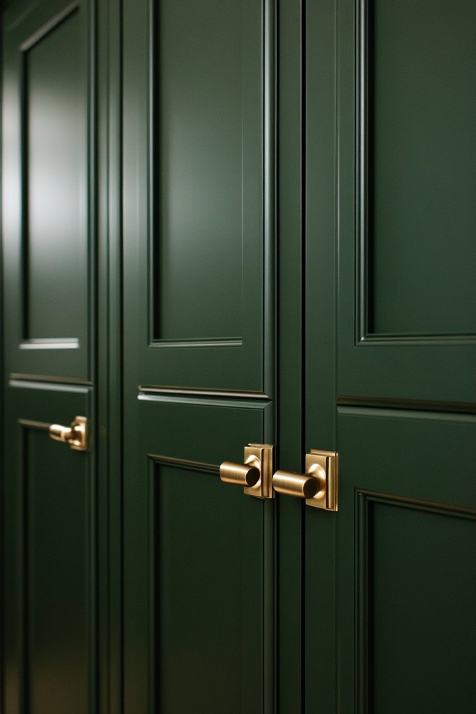 Imagine sleek, matte green cabinets with a velvety finish that absorbs light softly. The warm brushed gold hardware contrasts beautifully, catching your eye with subtle elegance. The textured matte surface adds a tactile richness, making every touch feel refined. The overall look exudes understated luxury, blending modern minimalism with classic warmth. It’s like a quiet statement piece that quietly commands attention.