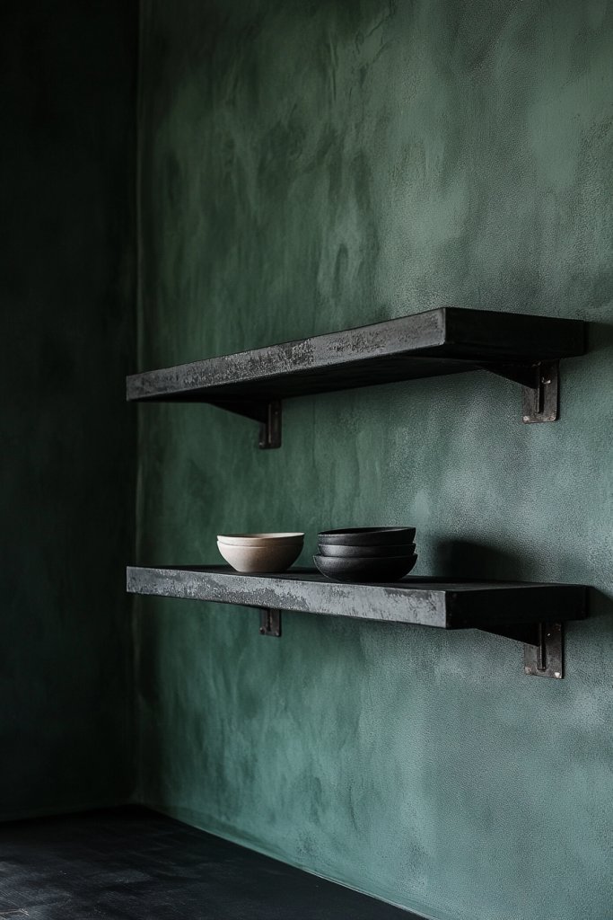 Visualize black steel pipes or brackets supporting dark green shelves with wooden or stone surfaces. The open design showcases your favorite kitchenware, tools, or decorative pieces. The matte black finish contrasts sharply with the deep green walls, creating a bold, layered look. The combination exudes industrial charm with a modern twist, adding depth and character.