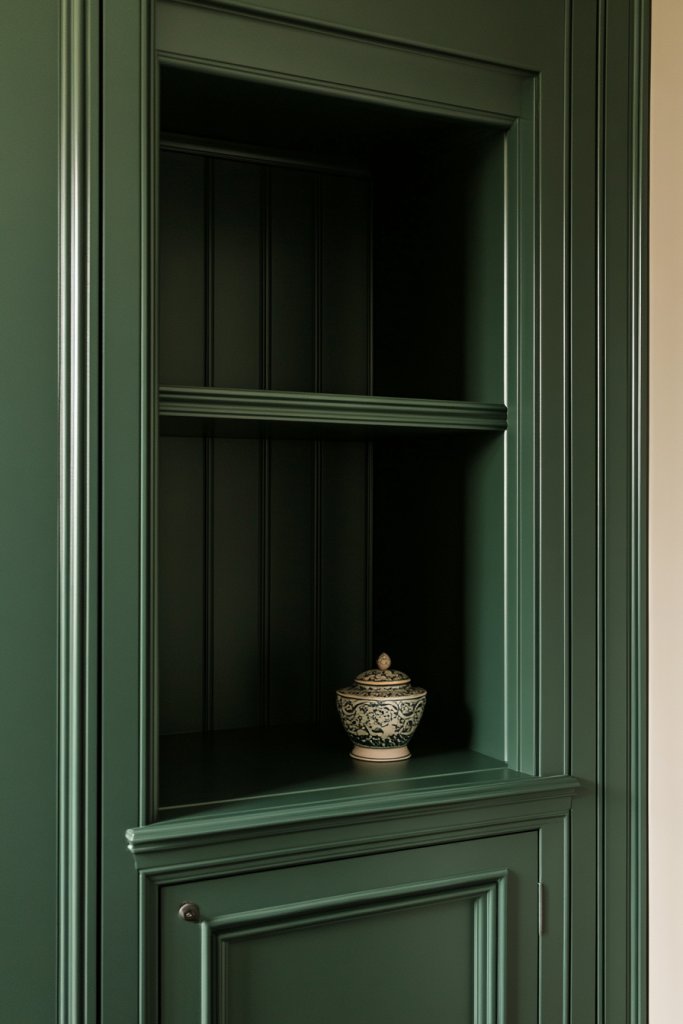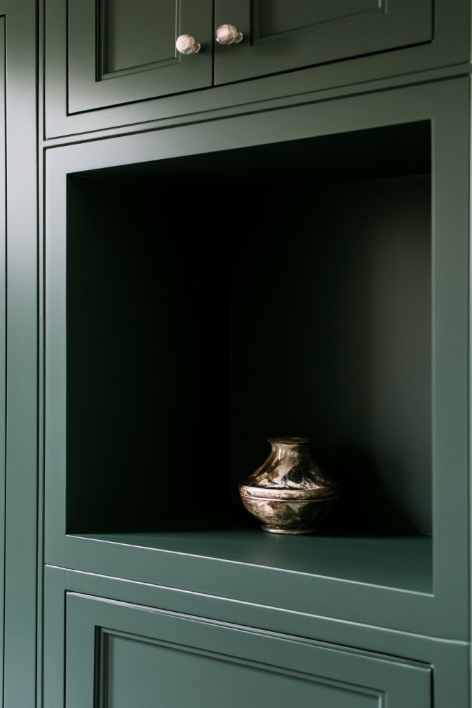 Imagine a small wall niche painted in a deep green hue, contrasting with surrounding lighter cabinetry or walls. Inside, minimalist shelving or built-in storage keeps essentials neatly tucked away. The dark green backdrop adds richness, making even simple items stand out. Soft lighting inside niches highlights their depth and creates inviting focal points. The overall effect is a subtle yet impactful way to add character.