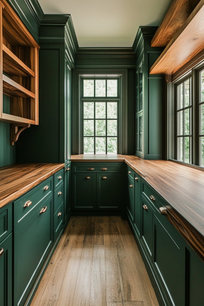 Feeling like your kitchen is too cold or sterile? Incorporating warm wooden elements with dark green cabinets creates a cozy, inviting atmosphere. It balances moody sophistication with natural comfort. If you want your space to feel both stylish and welcoming, this combo hits the sweet spot.