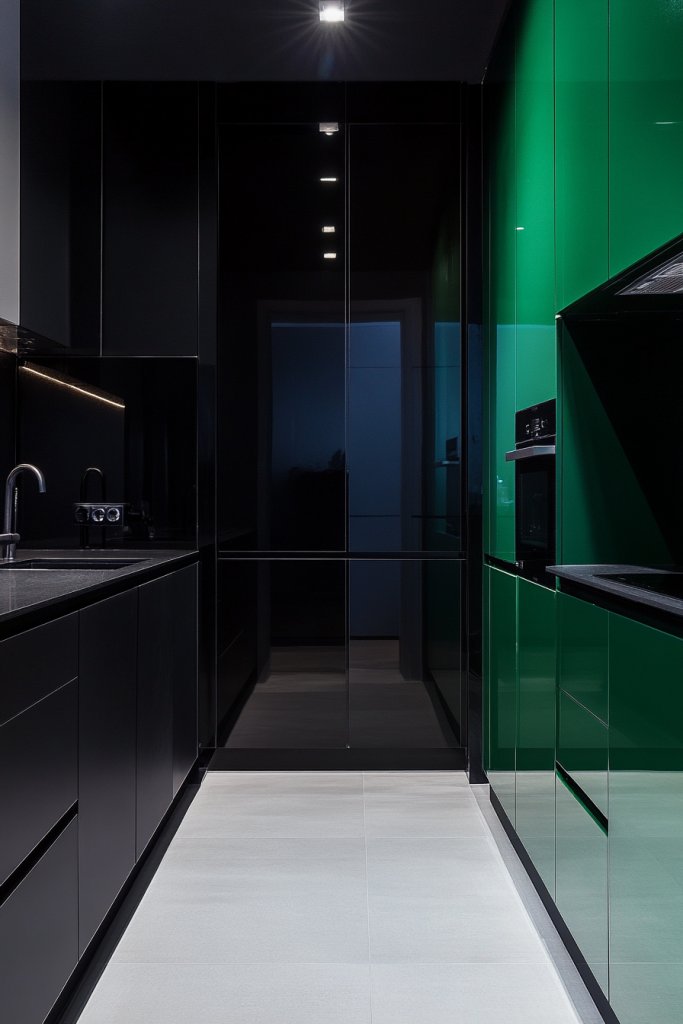 Imagine a kitchen divided into sections—dark green on one wall or cabinet set, with black geometric blocks or panels. The matte or textured finishes absorb light, adding depth and mystery. Sharp lines and contrasting colors create visual tension, making the space feel dynamic and energetic. The combination commands attention without feeling overwhelming.
