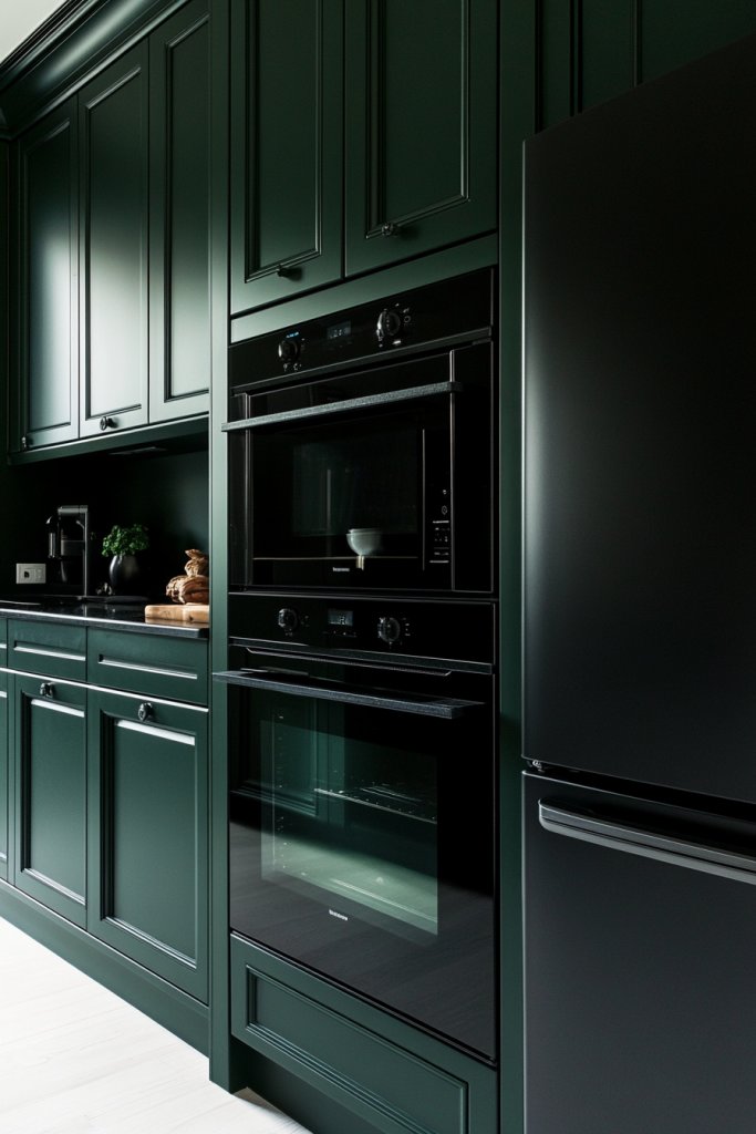 Picture matte black refrigerators, ovens, and dishwashers seamlessly integrated with dark green cabinets. The matte finish reduces glare, adding a velvety texture that’s both modern and luxurious. The deep green backdrop provides richness, while the black appliances add contrast without overpowering. The overall look is sleek, unified, and effortlessly chic.