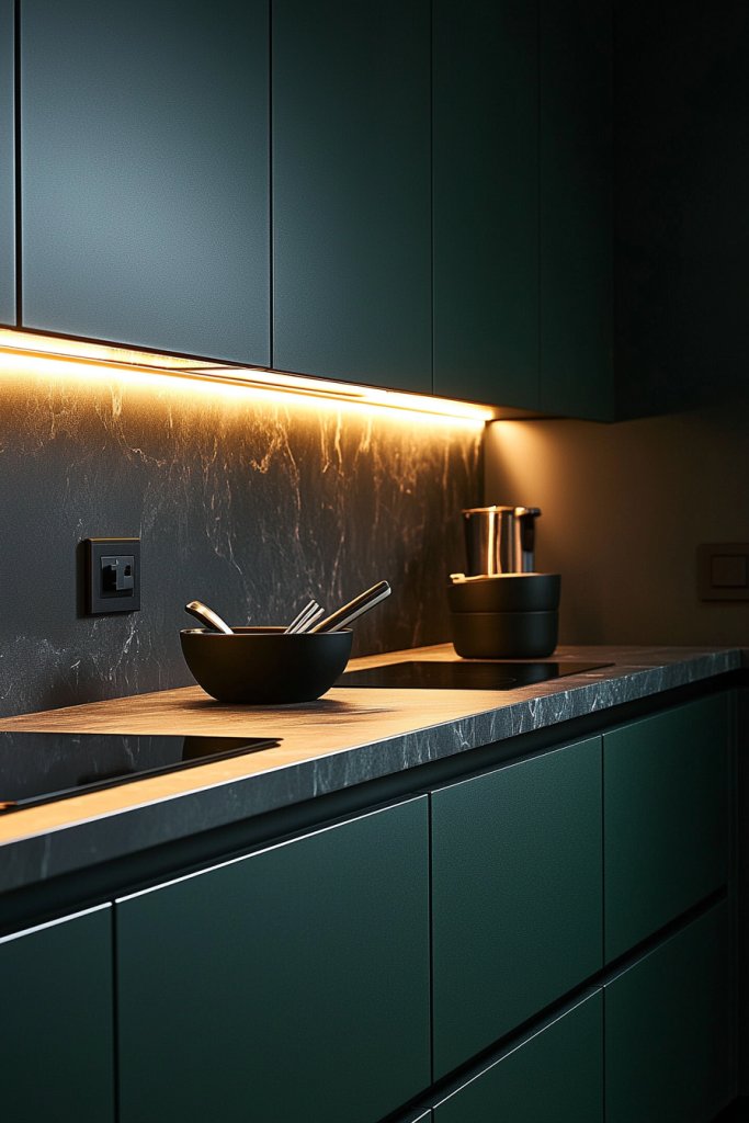 Imagine sleek dark green cabinets with concealed LED strips running underneath. The light softly illuminates countertops, accentuating the texture and color of your surfaces. The glow creates a cozy, inviting atmosphere, especially in the evenings. The hidden aspect keeps the design clean and uncluttered, emphasizing simplicity and modernity. It’s a functional feature that doubles as mood lighting.