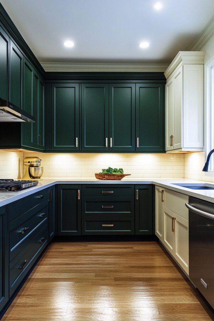 Picture the upper cabinets painted in rich dark green, with lower cabinets in deep charcoal gray. The contrasting tones create a layered effect, giving the room dimension. Matte finishes keep the look sleek, while subtle hardware in metallic or matte black ties the colors together. The interplay of shades adds personality without overwhelming the senses, making the space feel curated yet cohesive.