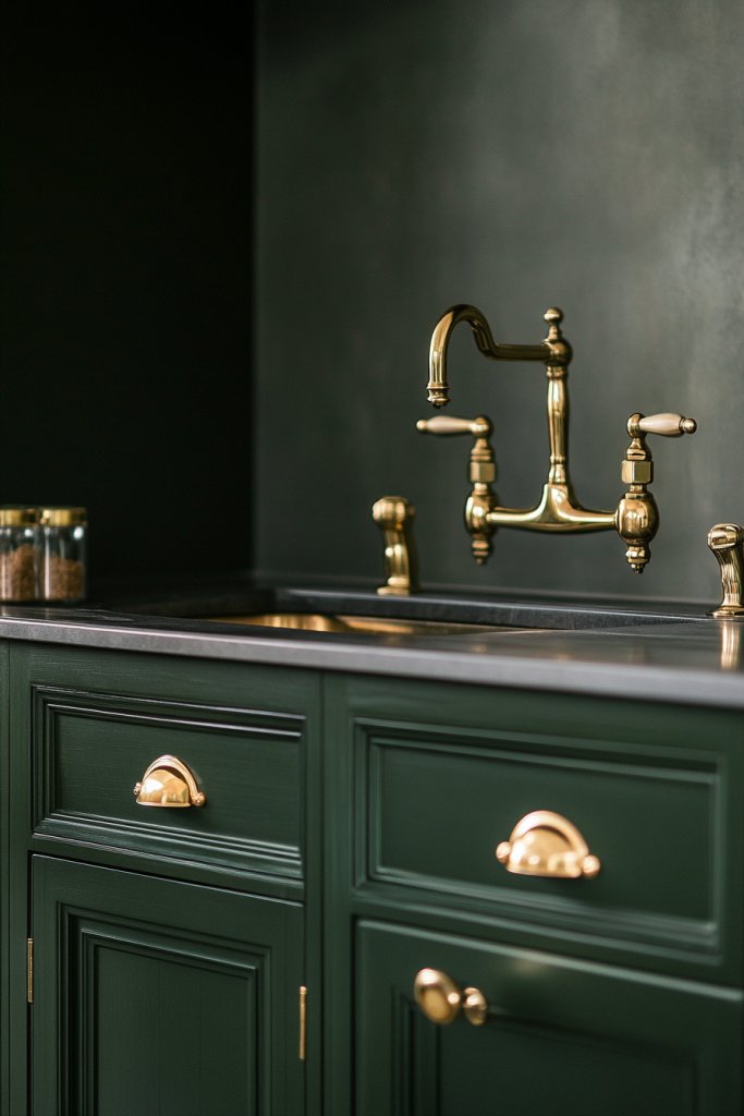 Imagine warm, patinated brass hardware, faucets, and lighting fixtures contrasting with deep green cabinets. The warm tones soften the moody palette, creating a cozy, inviting atmosphere. The vintage finish adds texture and history, blending seamlessly with modern elements for an eclectic look. The overall aesthetic is both nostalgic and refined, making everyday kitchen routines feel special.