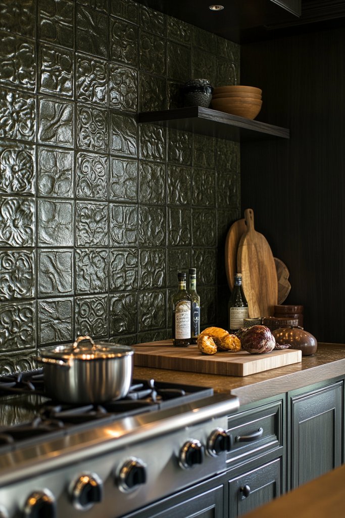 20. Dark Green Kitchen with Textured Backsplash Tiles