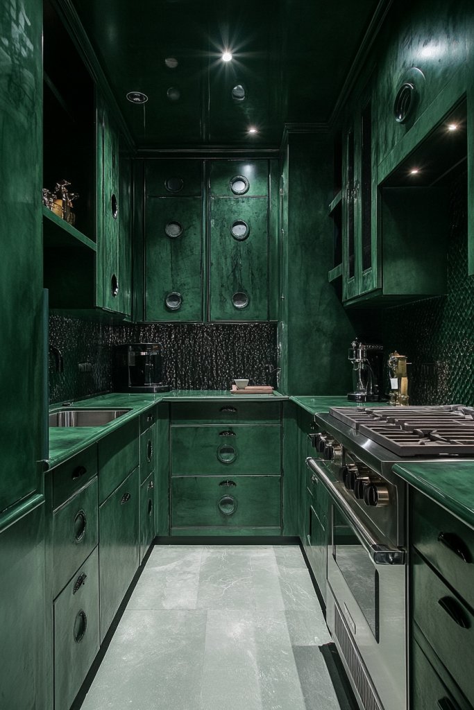 21. Monochromatic Dark Green Kitchen with Varied Textures