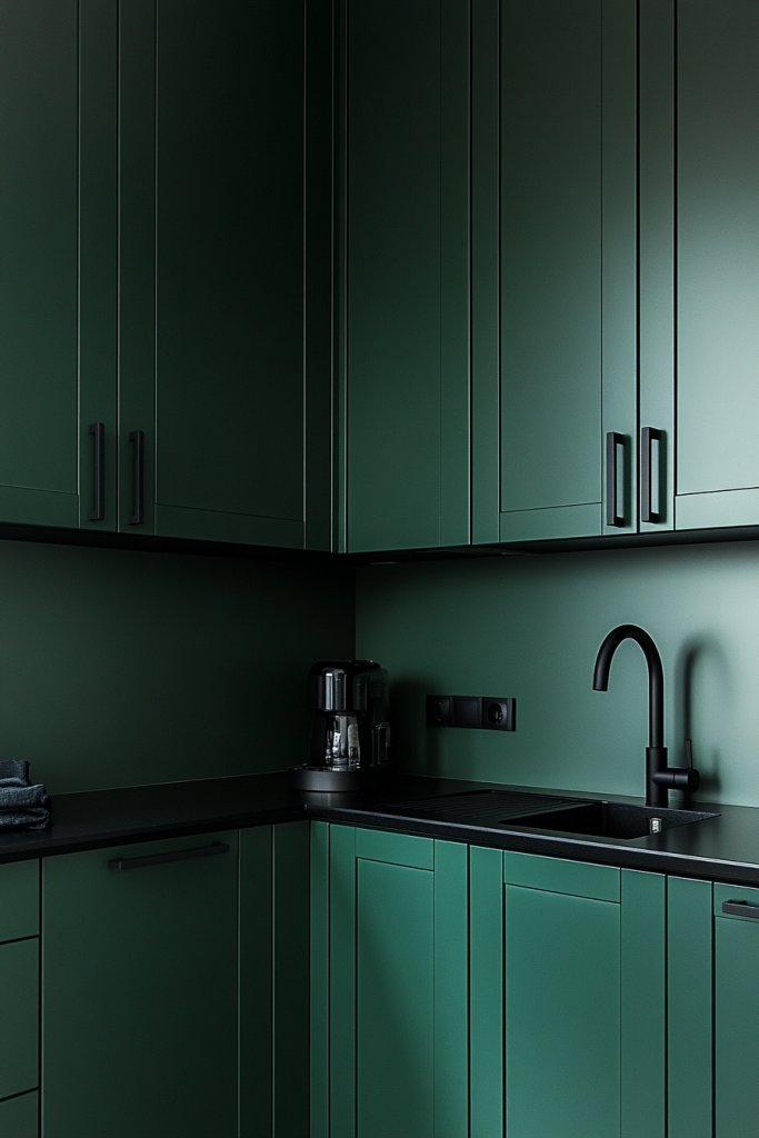 Visualize simple shaker-style cabinets painted in deep green with clean, square lines. The matte black fixtures provide a striking contrast, emphasizing the geometric simplicity. Soft light highlights the matte texture, avoiding reflections and adding sophistication. The overall vibe is minimalist but rich, with a subtle depth that invites closer inspection.
