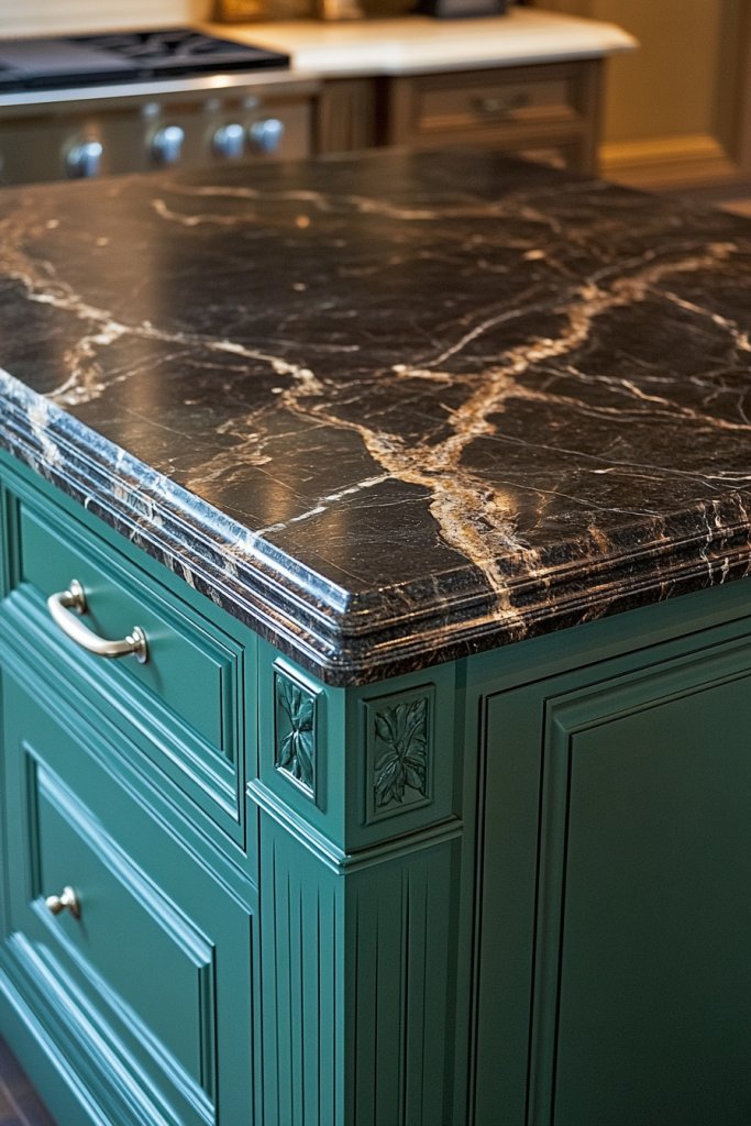 Envision a substantial island in a deep, velvety green with a polished dark marble surface that veins through with subtle metallic or white accents. The glossy surface reflects ambient light, enhancing the moody ambiance. The contrast between the matte green base and sleek marble top adds depth and texture. The island invites gathering and becomes the star of your kitchen, anchoring the entire design.