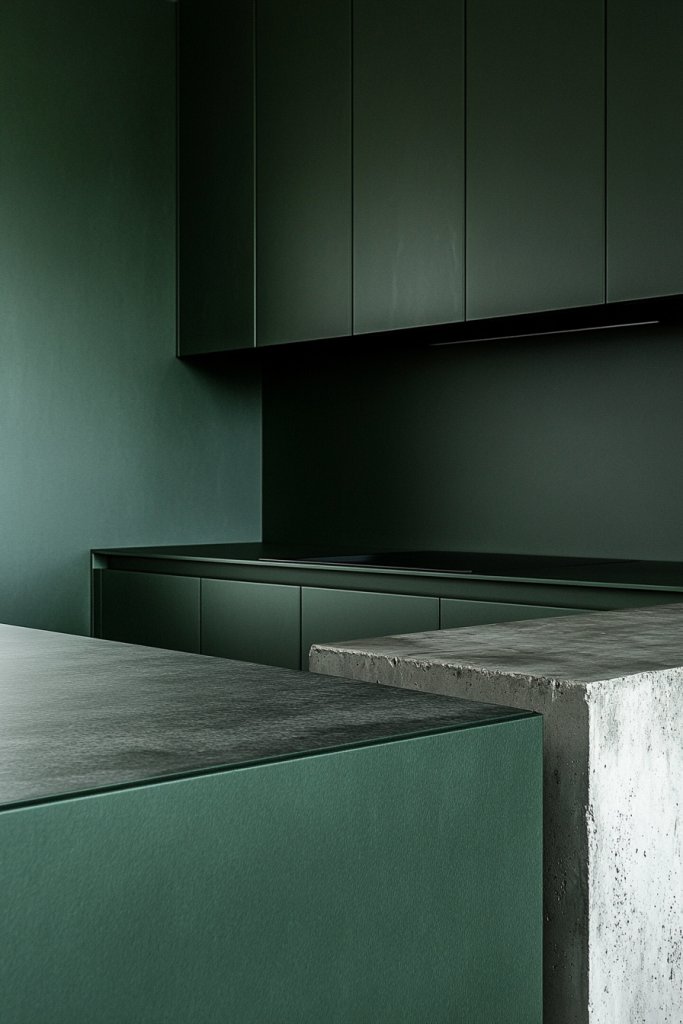 6. Minimalist Dark Green Cabinets Paired with Concrete Countertops