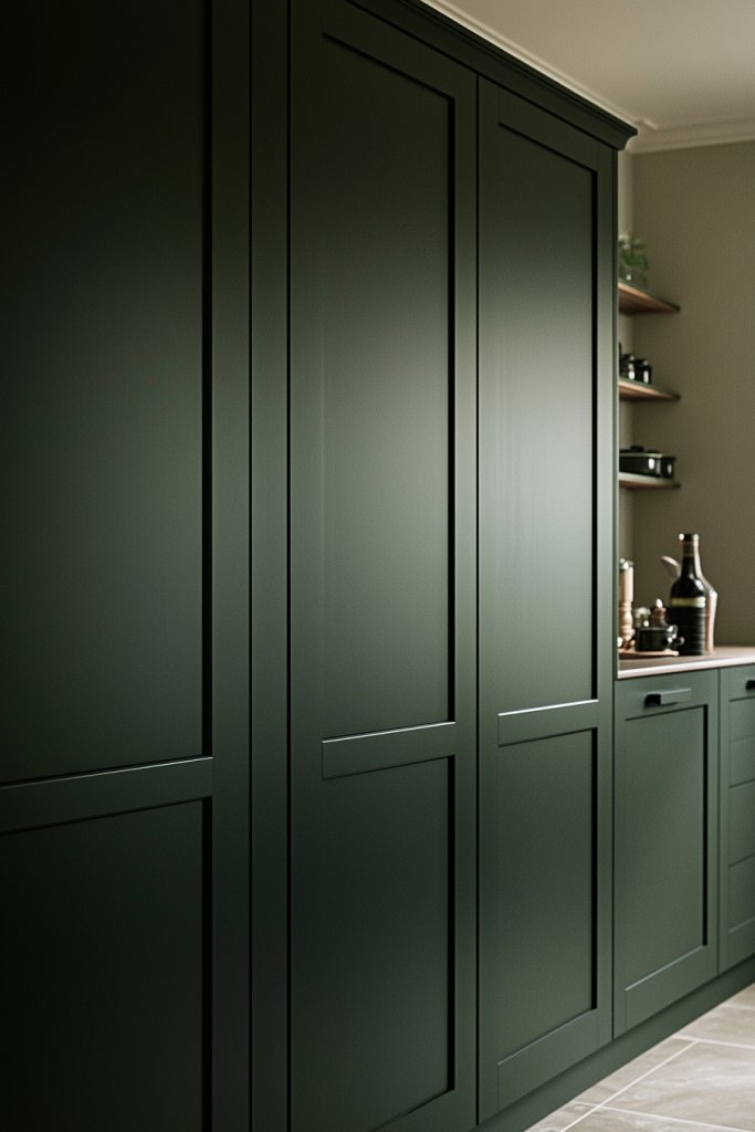 Picture tall, dark green pantry cabinets that stretch from floor to ceiling, with no visible handles or hardware. The seamless surface creates a clean, uninterrupted wall of storage. Inside, cleverly designed shelves and pull-out drawers keep everything in order. The dark color adds depth, while concealed mechanisms make the entire setup look sleek and modern. It’s like a hidden treasure chest for your kitchen.