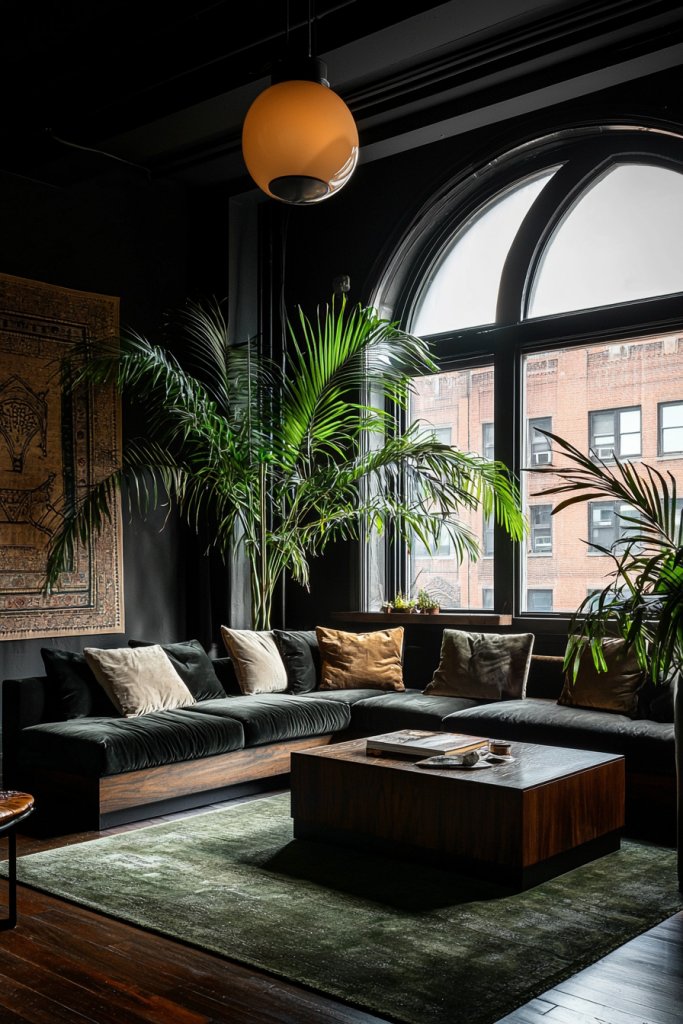 Don’t shy away from bold colors; a deep jewel-toned rug can ground the space while complementing your dark curtains. Statement art pieces or a striking mirror can serve as focal points, enhancing the eclectic vibe.