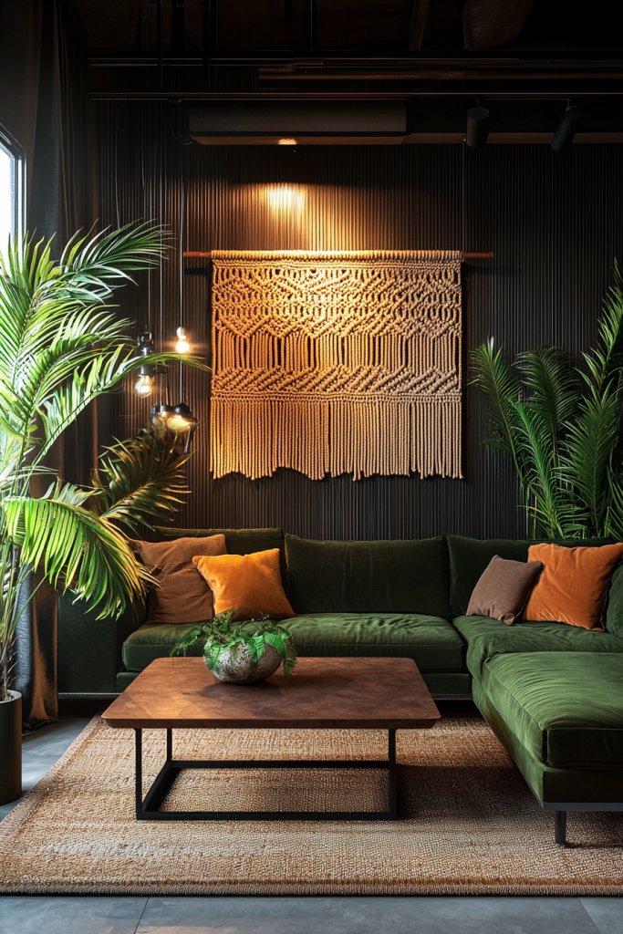 Macramé wall hangings can transform your dark boho living room into a stunning focal point. These intricate textiles add texture and depth, softening the room’s moody ambiance while enhancing its artistic flair.